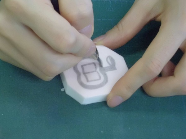 実際に作った様子を下に紹介するね!作り方の撮影モデルに名乗りを挙げたのは千雪さん!準備したのは右の道具。買ったのは消しゴムはんこ専用版のみ。(不器用だと主張するので、こっそりばんそうこうも準備)