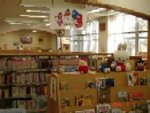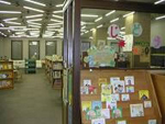 地下鉄「みなとくやくしょ」の駅からエレベータですぐの図書館。子どもの本のコーナーは、はじめに絵本があり、右手におはなしの本や、クイズ・動物・星・料理の本がならんでいます。