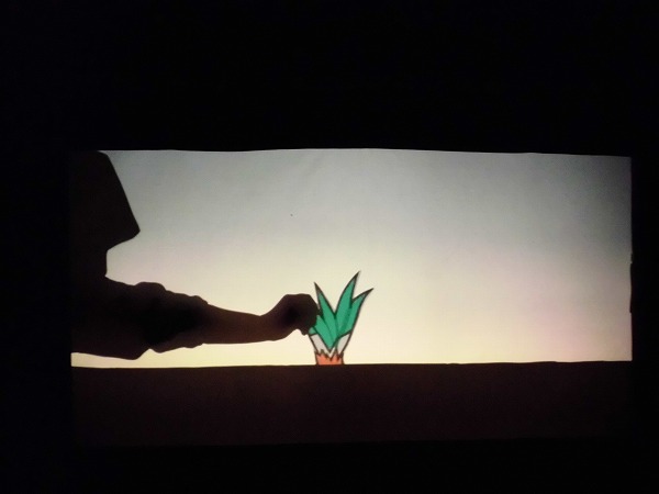 平成28年3月19日(土曜日)のあたたかい春の日、なんよう図書館に「かげえにんぎょうげき」がやってきました。 ジャックがおにのすみかから、たからものを持ち出すばめんでは、ハラハラドキドキ!ほかにも、かげえで当てる「おやさいなあに?」、うたのかげえ「おさんぽ」などをたのしみました。めずらしいかげえに、子どもたちはじーっと見入っていました。