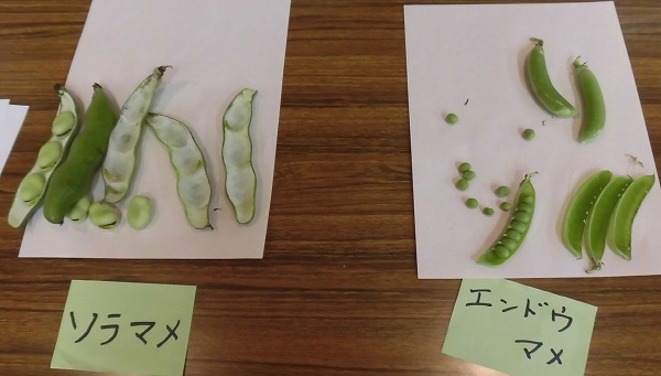 大型絵本『そらまめくんのベッド』や、葉っぱやわらびなどの写真絵本の読み聞かせとともに、本物のマメや葉っぱをさわってみました。大きなマメから小さなマメまで、本物をたっぷり見せてもらい、中でも植物園の方が世界一大きなマメ、モダマをとりだすと、子どもたちはおどろいて、マメと背比べしたりしていました。植物園の方に教えてもらいながら、葉っぱの形を紙の上にうかびあがらせるこすりだしもたっぷり楽しみました。