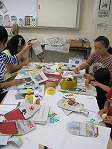さあ、いよいよエコスリッパをつくります。このエコスリッパは災害(さいがい)のときにやくに立ったそうですよ。しんぶんしは、あったかいんだから~!おり方はとってもかんたん!足の大きさをかんがえております。おったしんぶんしや色がようしを底(そこ)にしくと、じょうぶになるよ!色がみ・シールなどをつかって、じゆうにかざります。さいごに、スリッパを入れるふくろもつくりました。さあ、できあがり!子どもも大人もとってもたのしそうでしたよ。