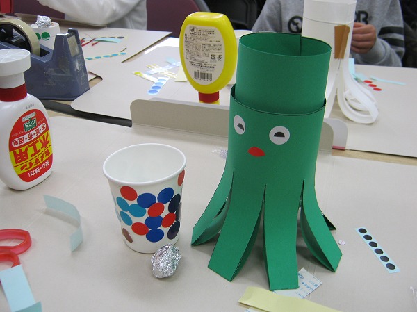 こうさくは、「パン!」の音といっしょに、紙コップの中から、小さく切ったストローやいろがみがとびだす「おもしろクラッカー」と、画用紙でつくったタコの足が、モノをもちあげる「タコさんクレーン」です。いろがみを切って、シールをはったり、絵をかいたり、みんな自由に作りました。タコのくちをつくった人もいましたよ。みんな、たのしんで作りました。