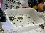 はじめに、魚、エビ、カメ、それに藻(も)など、矢田川にいる生きもののおはなしを聞きました。そのあとは、たくさんの水そうにわけて入れられたいきもののかんさつです。いろいろな魚などを、間近で見せてもらうことができました。