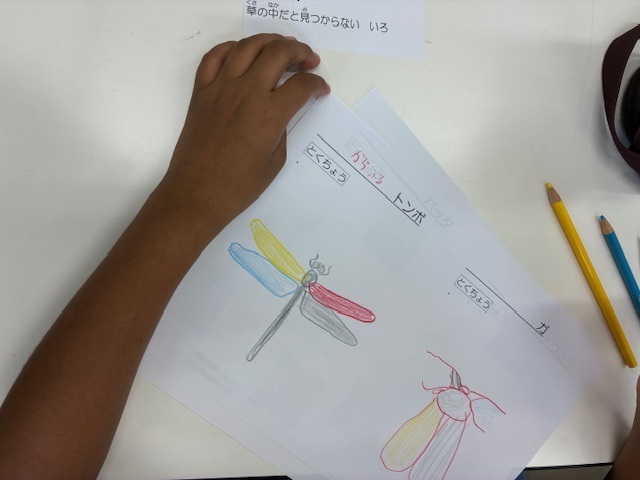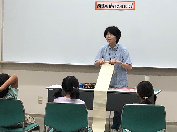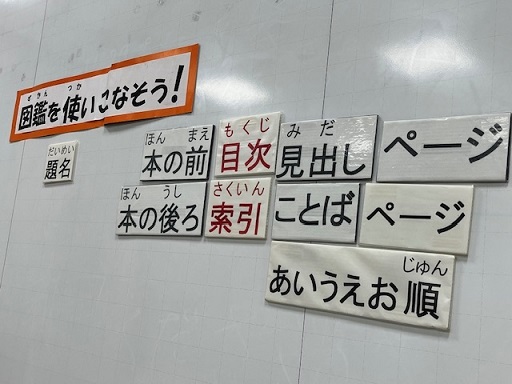 図鑑(ずかん)を見ながら、「もくじ」や「さくいん」のつかいかたをおしえてもらいました。そのあと、クイズのこたえをずかんでさがし、ぜんいん正解(せいかい)。みんな「しらべもの名人」になりました。