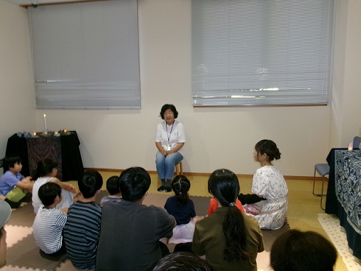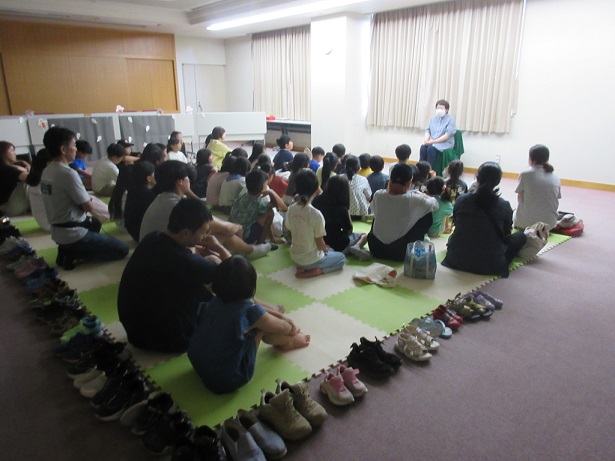 26人の親子が参加し、「馬方やまんば」「ちいちゃい、ちいちゃい」など5つのこわいおはなしを聞きました。猛暑の夏、ぞくぞくするおはなしで少しはひんやりできたかしら?