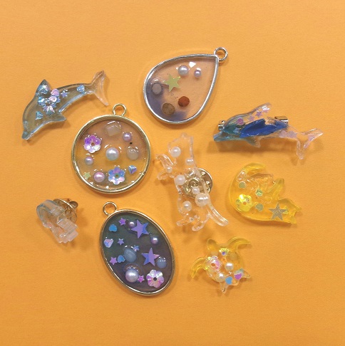 プラスチックごみについてのお話を聞いたあと、藤前干潟で採取したマイクロプラスチックを使ってアクセサリーを作りました。小さなかけらをレジン液に入れUVライトでかためると、すてきなアクセサリーができました。