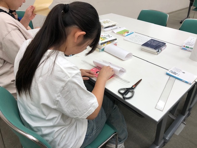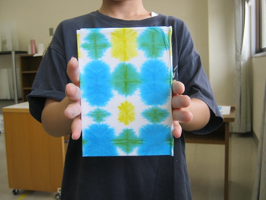 三角や四角に折った紙をそめてオリジナルの手帳を作ります。参加者は折り方のちがいでそめた紙のもようが変わる様子を楽しんでいました。