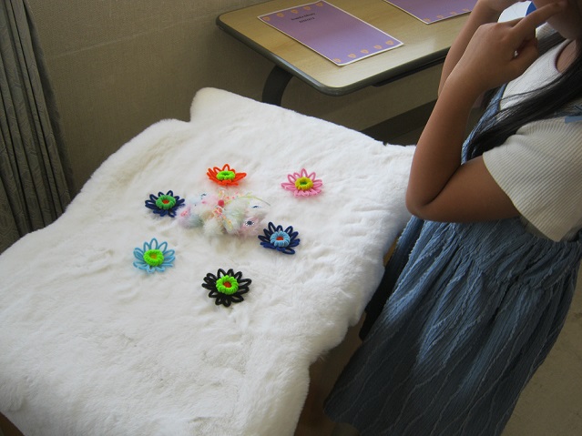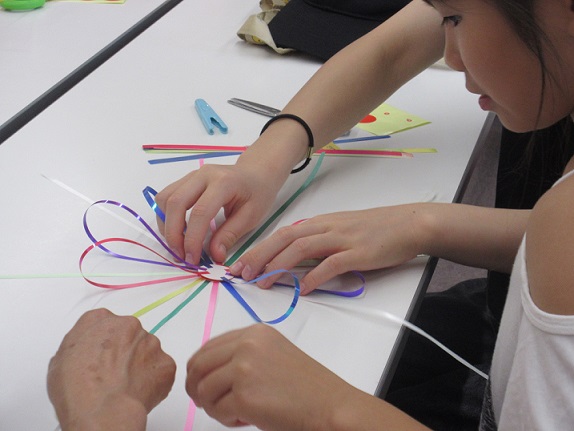 くるくるレインボーは回すとシャボン玉のようにみえるおもちゃです。今回は二重にした応用編に挑戦。テープを細く切るのは大変でしたが、参加者12名のほとんどが、難易度の高い「びっくりレインボー」を完成させました。