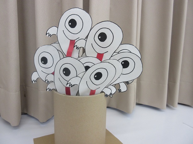 ストーリテリング(語り)だけのおはなし会で「金の髪」など5つのおはなしを楽しみました。参加者57名、みんな最後まで聞いてくれたのでおばけをプレゼントしました。
