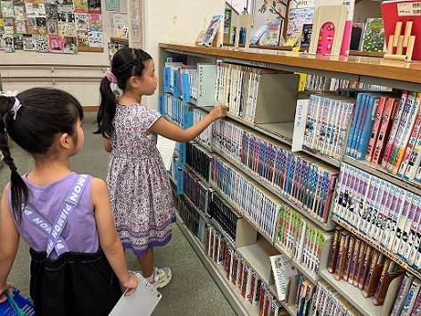 図書館探検の様子。返却ポストの裏側はどうなってるのかな?