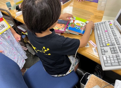 本にビニールをかけるやり方を見せてもらったよ。さあこんどは自分の本でちょうせんだ!