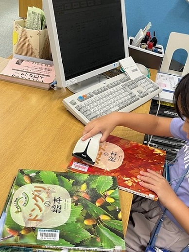 カウンターで本のかしだし・へんきゃくをしたり、本にカバーをかけたりしました。