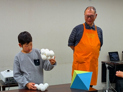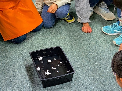 みなみ図書館では、2026年3月7日(土よう日)に「大道仮説実験<ならんでならんで>講座」をおこないました。 13名の方が、親子で、家族みんなで、参加してくれました。 まるい球をパズルみたいに組み合わせていくうちに、ふしぎふしぎ、小さな小さな粒の世界が見えてくる気がしました。教科書にはのっていない、きれいなミョウバンの結晶の作り方も教えてもらい、得した気分! まるい球のあつまりを正八面体にするには...どう組み合わせればいいのかな? 水の中に発砲スチロールのまるい球を落とすと...球と球とが勝手にくっつきます!