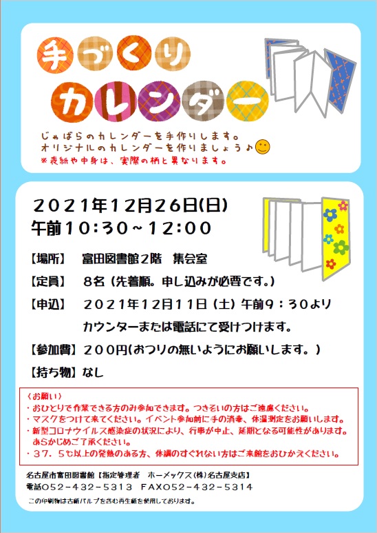 富田図書館では、2021年12月26日(日曜日)に、「手づくりカレンダー」を開催します。