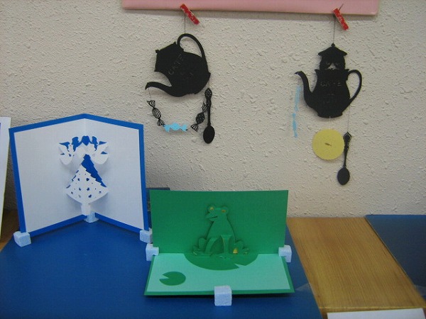最初に、かわいい「くま」のポップアップカードを作りました。一番むずかしいのは、やわらかい線を切ることと、切った線と線がうまくつながらないことでした。そして、切ったあとは、見本をみながら山折り、谷折りをして、クマちゃんと本を手前に立体的に引き出します。苦労しましたが、みなさん、ほんとうにすてきな作品にしあがりました。