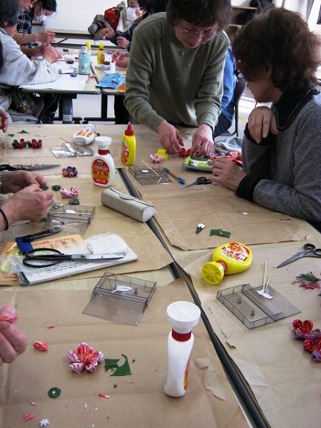 みなさん真剣にそして楽しく受講され、すてきな作品が出来上がりました。つまみ細工の本も展示して貸出しました。