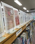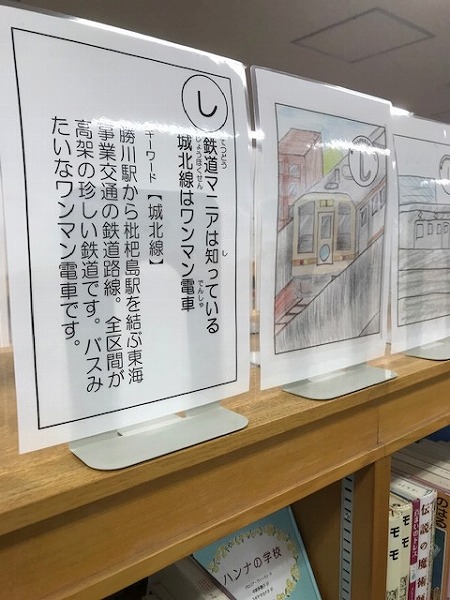 展示スペースは、児童書の本棚です。本を選びながら、三ツ川カルタ(絵札の原画、解説付きの読み札)をお楽しみいただけます。