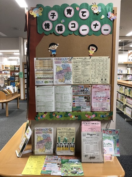 かわいい「子育て情報コーナー」ができました。 熱田図書館では、児童フロアの「おしらせ」掲示板の右隣に、「子育て情報コーナー」を新設しました。 熱田区内の子育て支援センターや児童館の案内、学区の子育てサロンや保育園の園庭開放日のお知らせ、お子さんと一緒に参加できるイベントのちらしなどを集めました。 今後も、子育てに役立つ情報を随時お知らせしていきます。 熱田図書館にご来館の際には、ぜひ「子育て情報コーナー」にもお立ち寄りください。