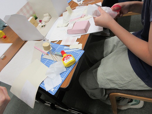 ケーキ箱をお部屋に見立てて、本物の床材やミニチュアの家具を好きなように配置します。