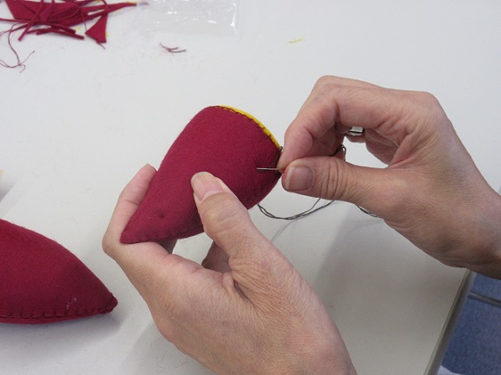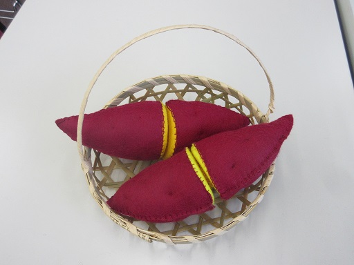 フェルトと綿をつかってつくる、二つに割れるやきいもです。9人の参加者の内、4人がお子さん連れ。