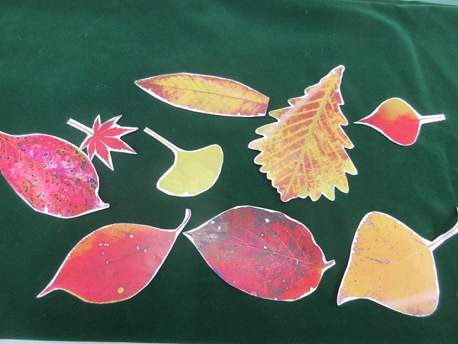 休憩時間には、「ゆーすりゃゆすりゃ」のわらべうたにのせて、おち葉の名前当てクイズも楽しみました。