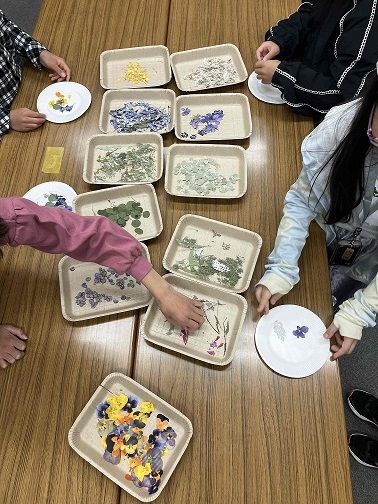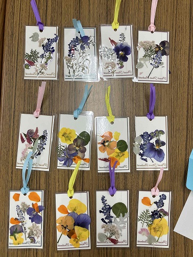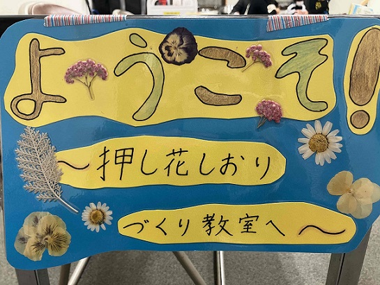 桜田中学校園芸部のみなさんが育てたお花を使ったしおりづくり教室で、34名の参加がありました。