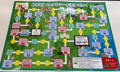 最初に手作り紙芝居を使って「フェアトレード」について学び、その後「めざせ!フェアトレード王すごろく」で楽しく遊びました。