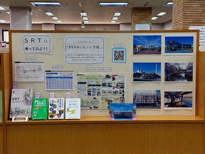 鶴舞中央図書館1階の中区・昭和区コーナーで「SRTに乗ってみよう」と題して展示をしています。