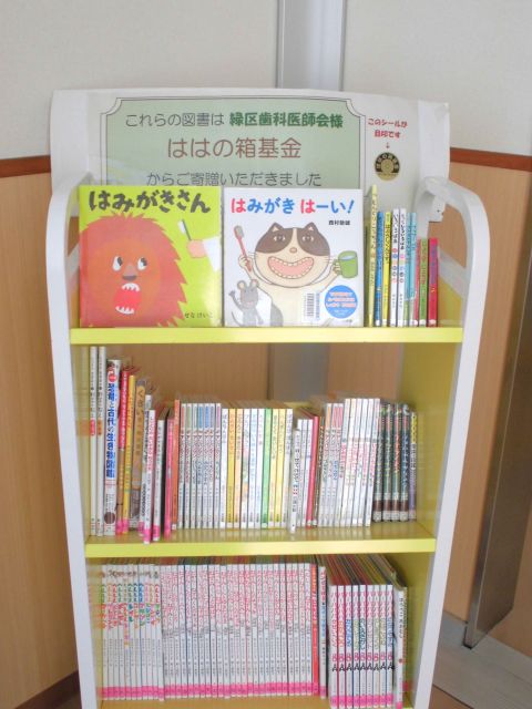 絵本を中心に、食育の本や図鑑など子どもたちに人気のシリーズをご寄贈いただき、緑区歯科医師会の方々のご厚意に改めて感謝いたしました。