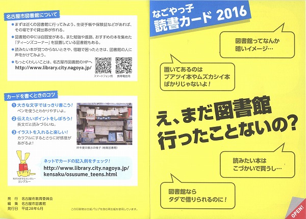 主にティーンズ世代に向けて毎年発行している読書カードを、今年も配布しています。読んでおもしろい本があったら、カードを書いて、お近くの図書館までお持ちください。本の紹介などに活用させていただきます。