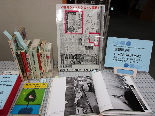 平成29年1月29日(日曜日)に、イーブルなごやホールで、公開講演会「前畑ガンバレ!ガンバレニッポン」が開催されます。その関連企画として鶴舞中央図書館では、「前畑秀子パネル展」を1階玄関付近にて開催します。あわせて関連本の展示を2階で行います。ぜひおこしください。