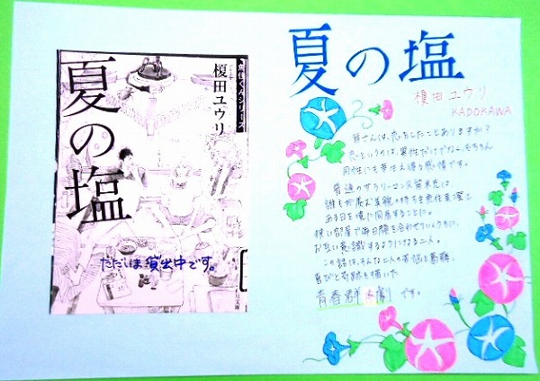 名古屋市立桜台高校の図書委員のみなさんに、読書カード(32点)やオリジナルのPOP(10点)を書いてもらいました。読書カードやPOPを、本と一緒にティーンズコーナーに展示します。